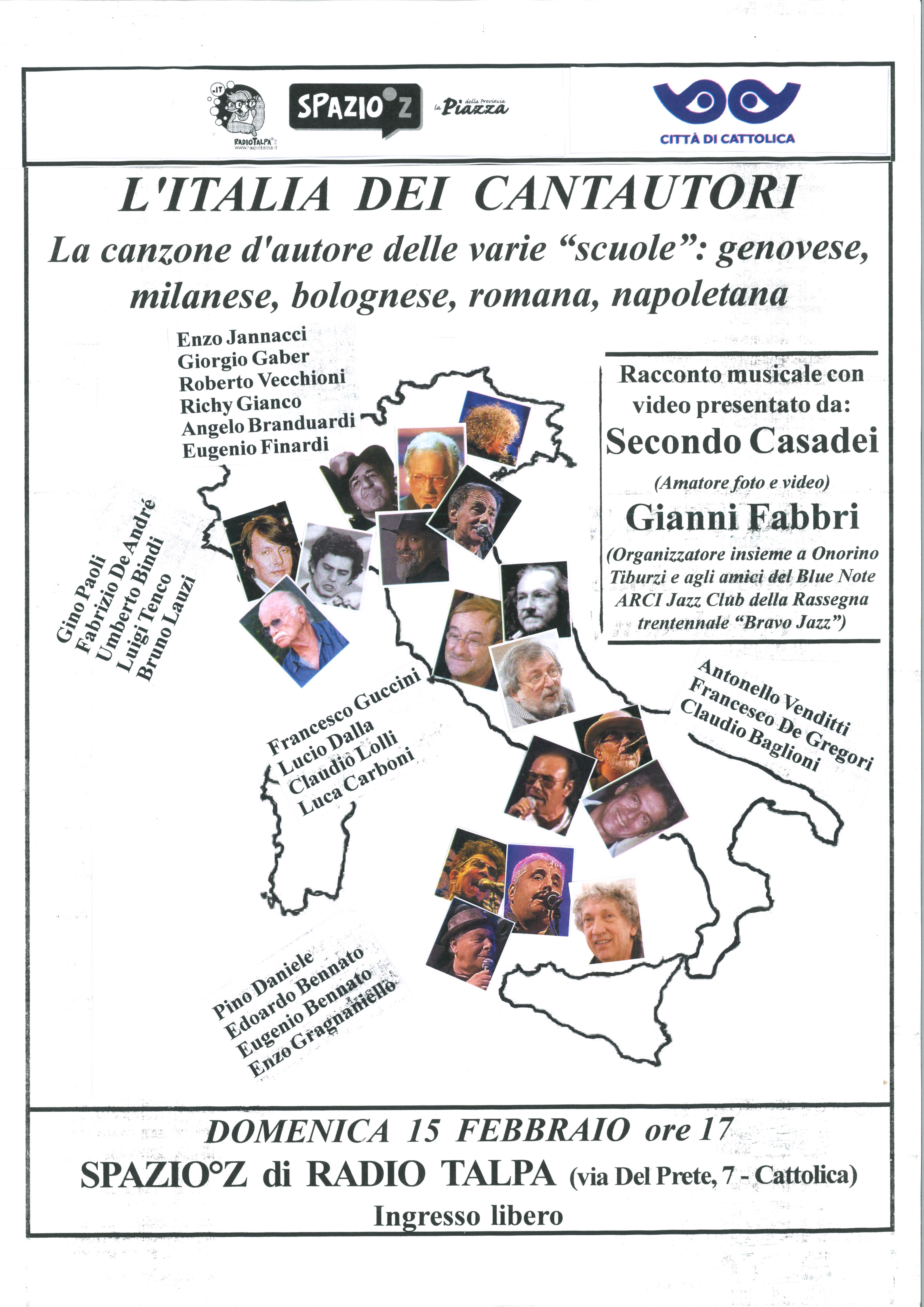 Domenica 15 febbraio alle ore 17 presso Spazio Z Radio Talpa (Via del Prete 7), incontro dedicato al tema "L'Italia dei Cantautori. La canzone d'autore delle varie “scuole”: genovese, milanese, bolognese, romana, napoletana"