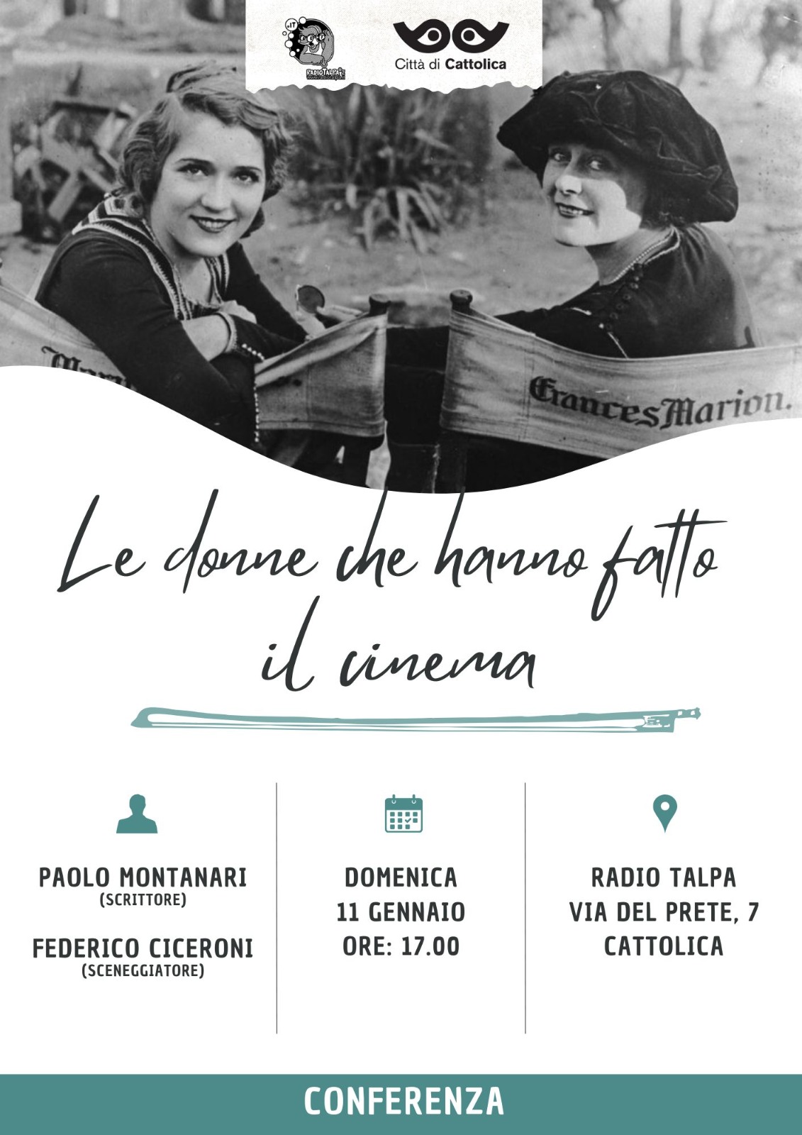 Domenica 11 gennaio alle ore 17, Radio Talpa ci accompagna in un viaggio alla scoperta delle donne che hanno contribuito alla nascita e allo sviluppo del cinema nei primi decenni di vita di quest'arte. Dopo una introduzione dello scrittore Paolo Montanari, lo sceneggiatore Federico Ciceroni, col supporto di immagini di film, ci accompagnerà alla scoperta di alcune delle registe, sceneggiatrici e attrici più significative di quell'epoca, che con la loro libertà espressiva e la volontà di affrontare temi "scomodi" hanno segnato la storia del Cinema.